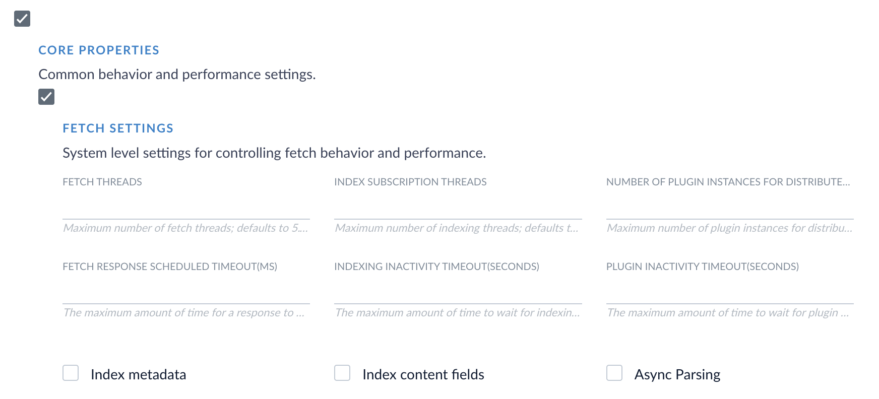 The following Solr components and parameters can be configured:- collection/core (also allows default/empty core)
