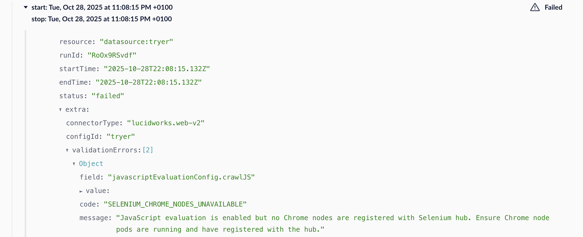The Web V2 connector has been updated to version 2.2.1.These enhancements improve JavaScript execution reliability for dynamic content and resolve inconsistent crawling behavior on JavaScript heavy sites. They offer more precise control over how the Web V2 connector processes and indexes complex pages.A verification check is added to ensure the Selenium service is running whenever JavaScript evaluation is enabled, improving stability and preventing runtime errors. If the verification check fails, you will see a